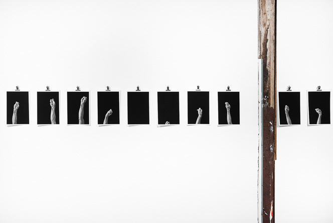 A series of seventy-seven black and white photographs of my hand clenched into a fist
