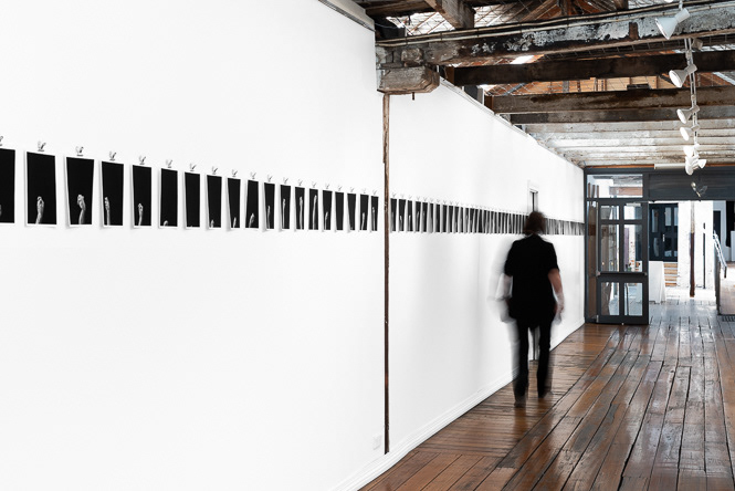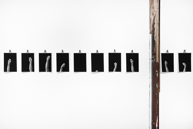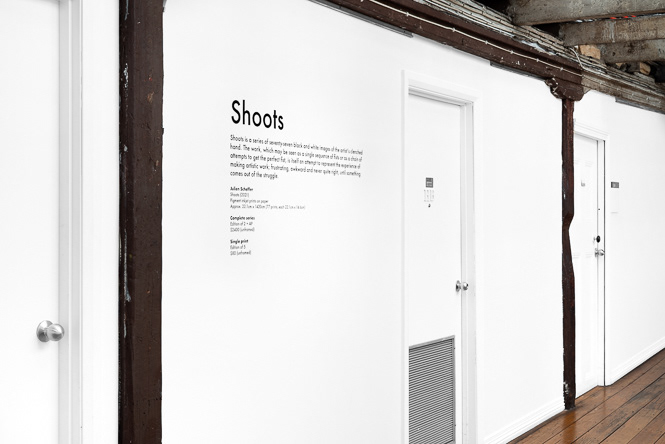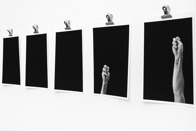 Shoots is a series of seventy-seven black and white photographs of my hand, clenched. Initially an attempt to study the expressive potential of a simple fist, the work developed into a metaphor for the process of creating artistic work. The series draws analogies between the shape of a clenched hand and that of a sprouting plant to explore concepts of randomness and persistence inherent in both the struggle for artists to innovate and the struggle for plants to grow. The aesthetic and presentation of the work is a nod to the 19th century production of the first high-speed photographic sequences of human and animal movement which later gave rise to animated sequences and cinema. The series consists of a long row of prints spaced in a way that enables the viewer to experience it both as a cinematic sequence – as one walks past – and as a collection of individual portraits – as one stands still.